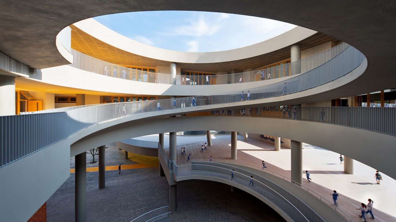 مدرسهی دوم، Weiwu که در میان برجهای مسکونی قرار گرفته، پاسخ متفاوتی به همان مسئله میدهد. این ساختمان با حداکثرسازی استفاده از زمین محدود، حول یک حیاط مرکزی رنگین سازمان یافته است؛ فضایی که هم نقش زمین بازی را دارد و هم بهعنوان بستر رویدادهای محلی، به روی جامعهی پیرامون گشوده میشود. این تصمیم، مرز میان مدرسه و محله را کمرنگ میکند و آموزش را از یک عملکرد بسته، به کنشی اجتماعی بدل میسازد.